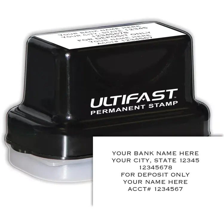 This unique multi-surface bank stamp is designed as an endorsement stamp to use on our plastic bags or deposit tickets, making it even easier and more accurate to deposit your money. Special, quick-drying ink allows the impression to adhere to multiple surfaces.