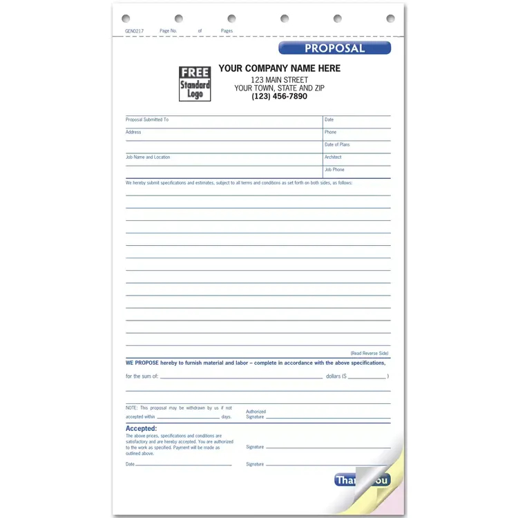 Go carbonless for a greener, cleaner choice that won't leave ink on your fingers. No carbon sheet to throw away means greater security, too. Get the job done with these customized carbonless proposals! Specifically designed to help you include all the details your prospects need to choose you. Also avoid misunderstandings by having customers sign off on your terms.