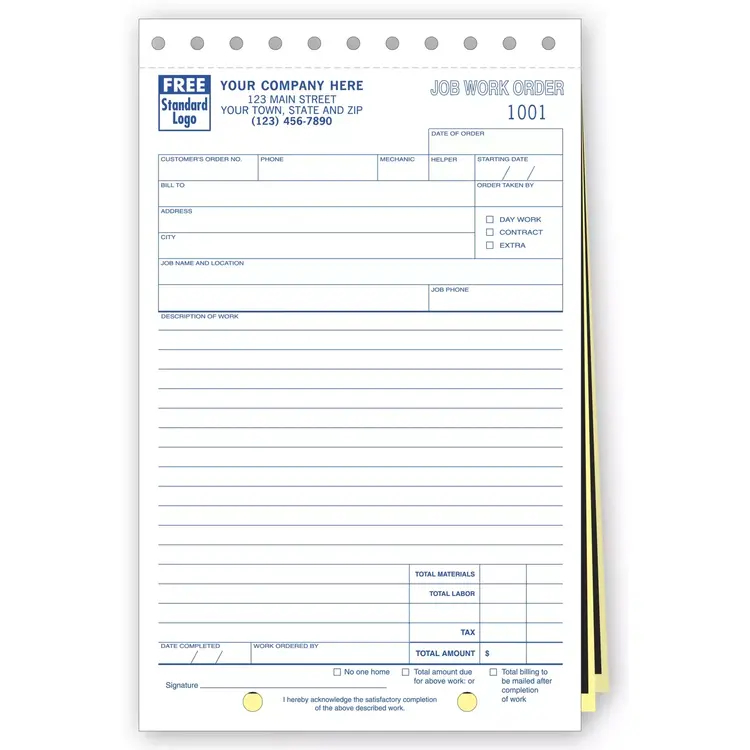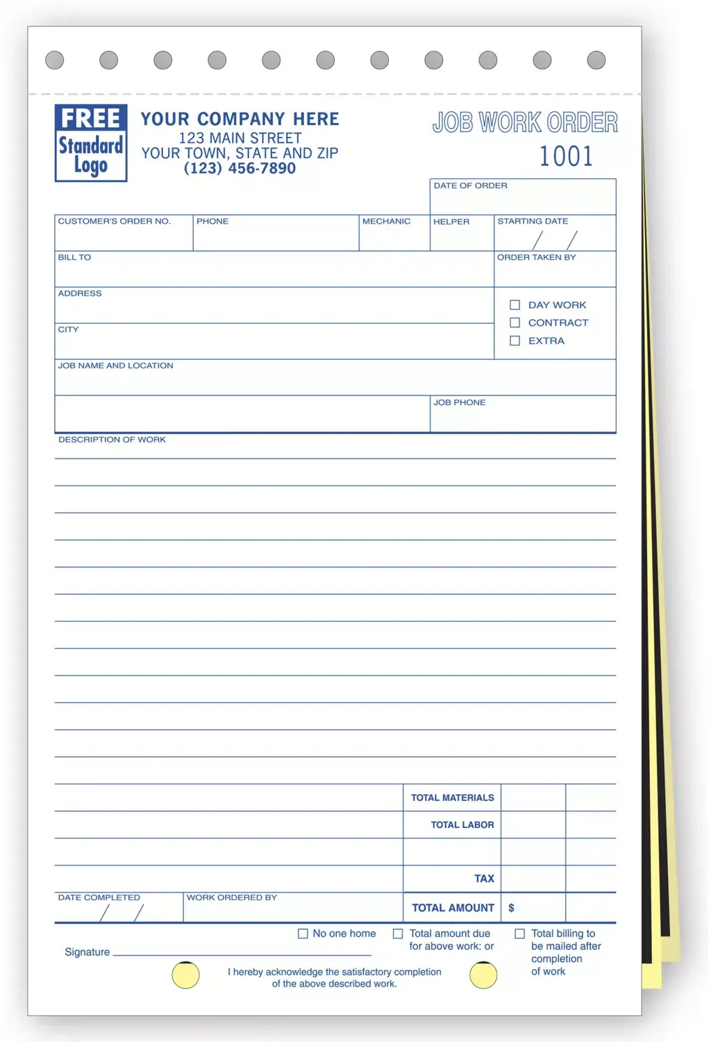 Use personalized job work orders to gain credibility! These personalized job work orders use carbon sheets to transfer writing to the second copy.