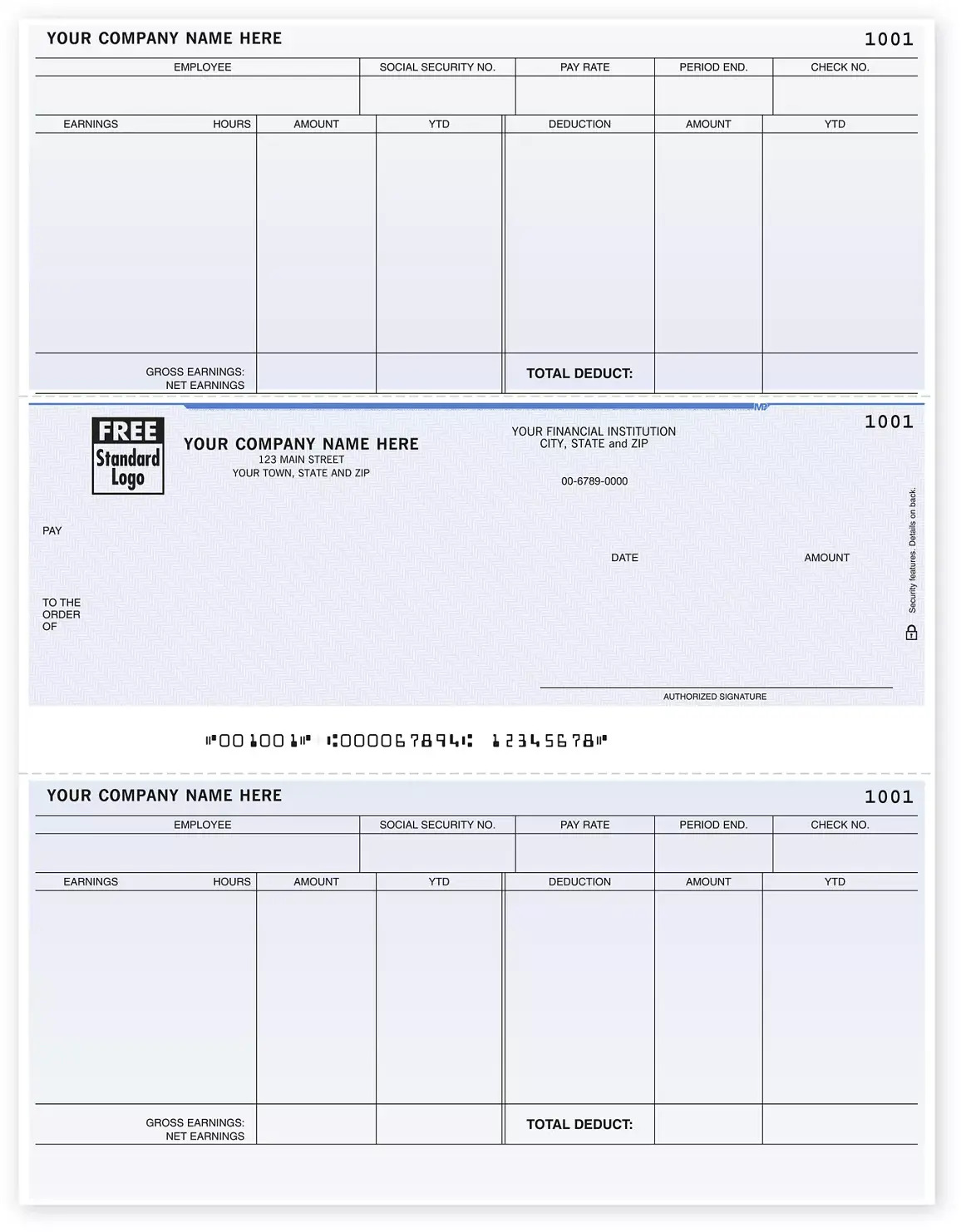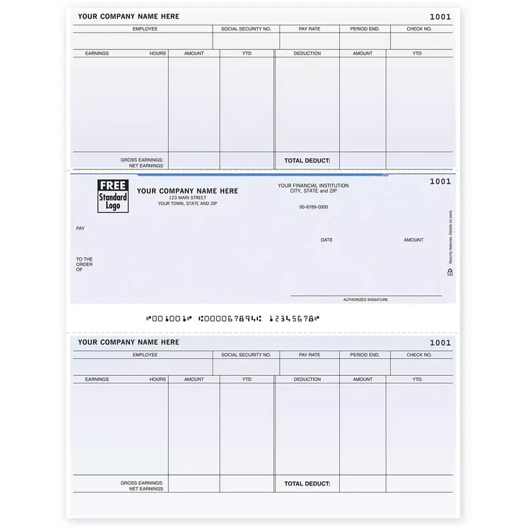 These laser Sage 100 business checks are specifically designed for your payroll needs. They come with 2 handy detachable stubs with pre-printed columns and headers to record your necessary information like hours, earnings, and deductions. Compatible with Sage MasĀ® software and for use with laser or inkjet printers. Personalize with your logo and choose your check background.
