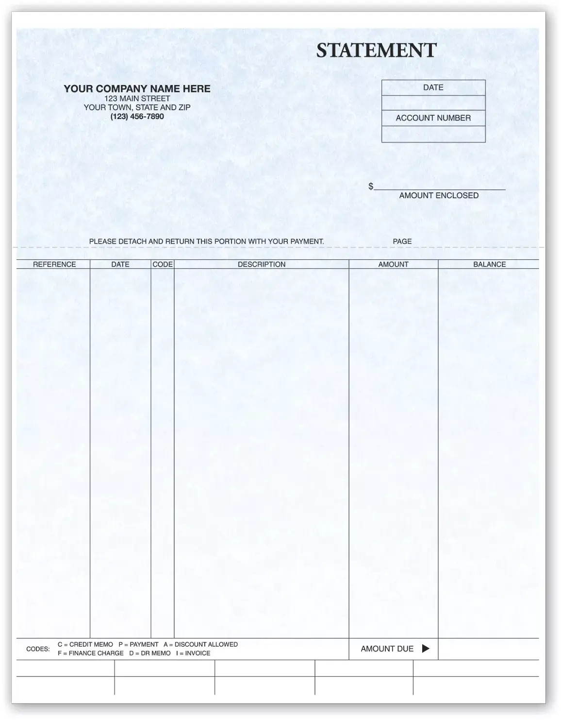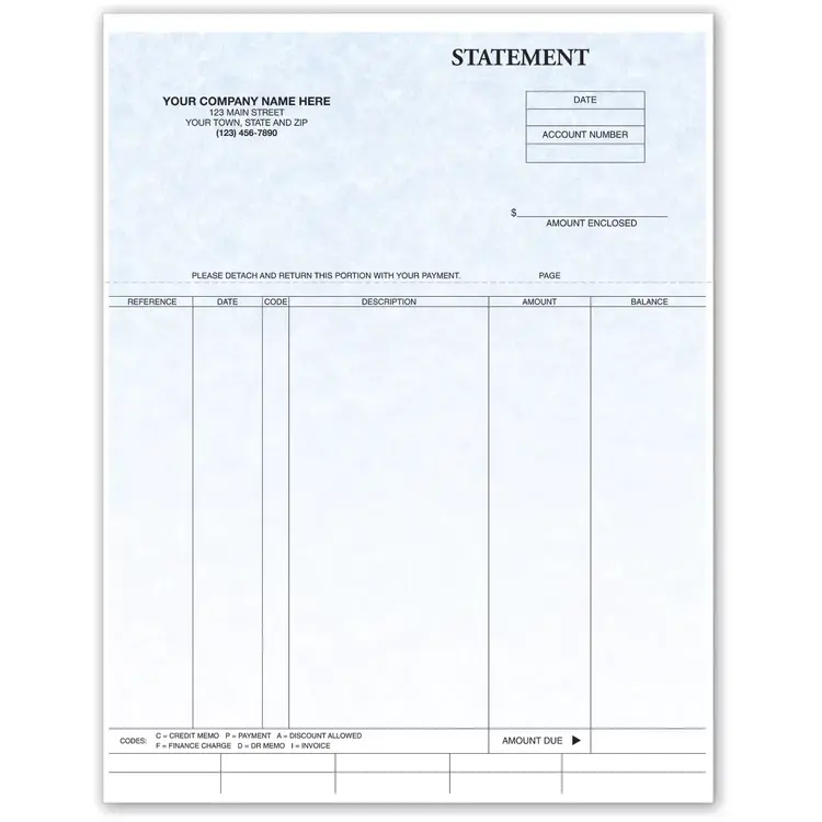 Offer your customers a professional image with these Solomon III Laser Statements. It boasts a detachable stub to allow for easy customer payment. An eye-pleasing background makes for an attractive statement. Customization includes your business imprint as well as choice of typestyle.