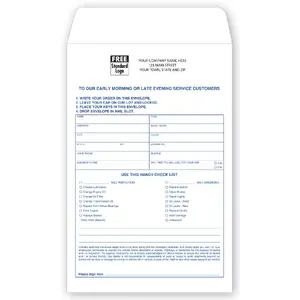 Our automotive envelopes are perfect for car repair shops, body shops and service stations. These overnight repair envelopes let your customers drop off their keys at your location so all you have to do is come in the next morning and get started on your car repairs!