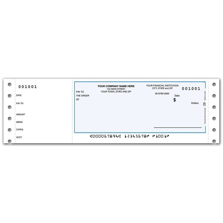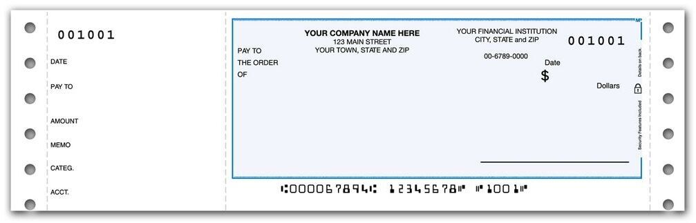 These continuous Quicken ® business checks are convenient because they have been designed to work with major software. Software like Quicken®, QuickBooks ® and Microsoft ® money. These versatile checks come with a detachable side stub to record expenses. Choose from 2 background colours and various typestyles.
