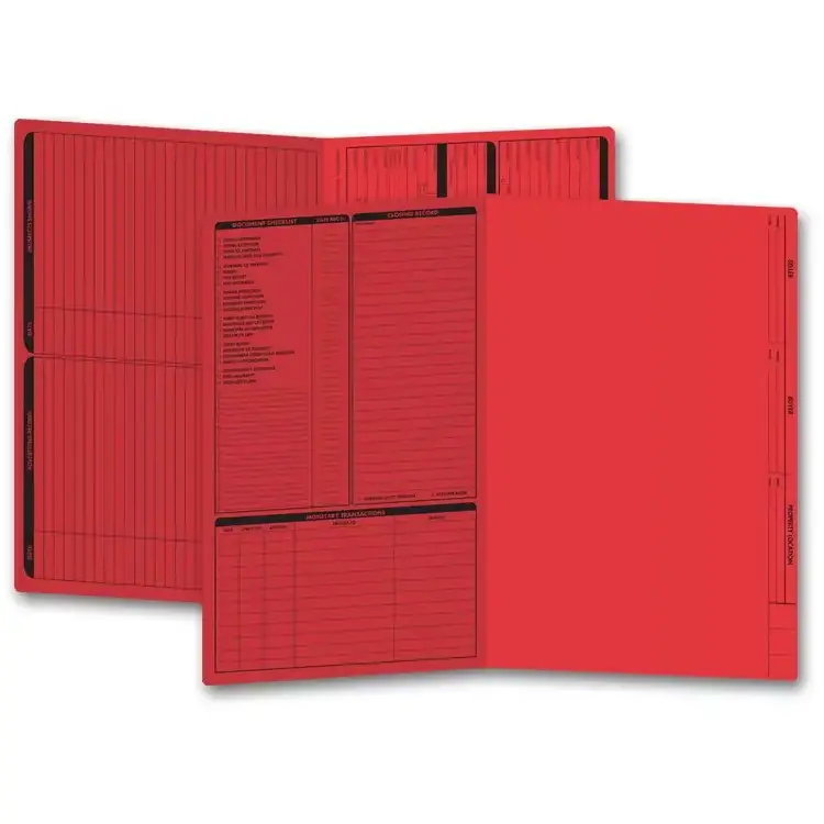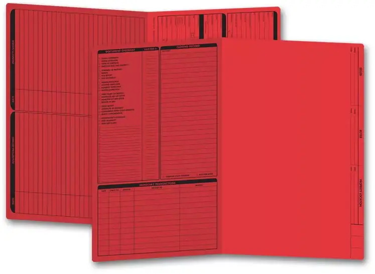• Closing checklist is preprinted on the inside left panel to allow you to store documents on the right side