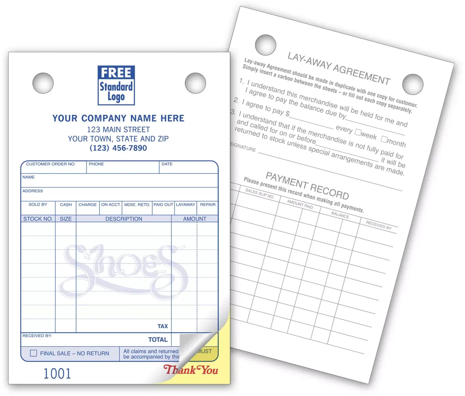 Get more detail than a cash register receipt! This compact order form has been designed for shoe sales and comes printed at no extra charge.