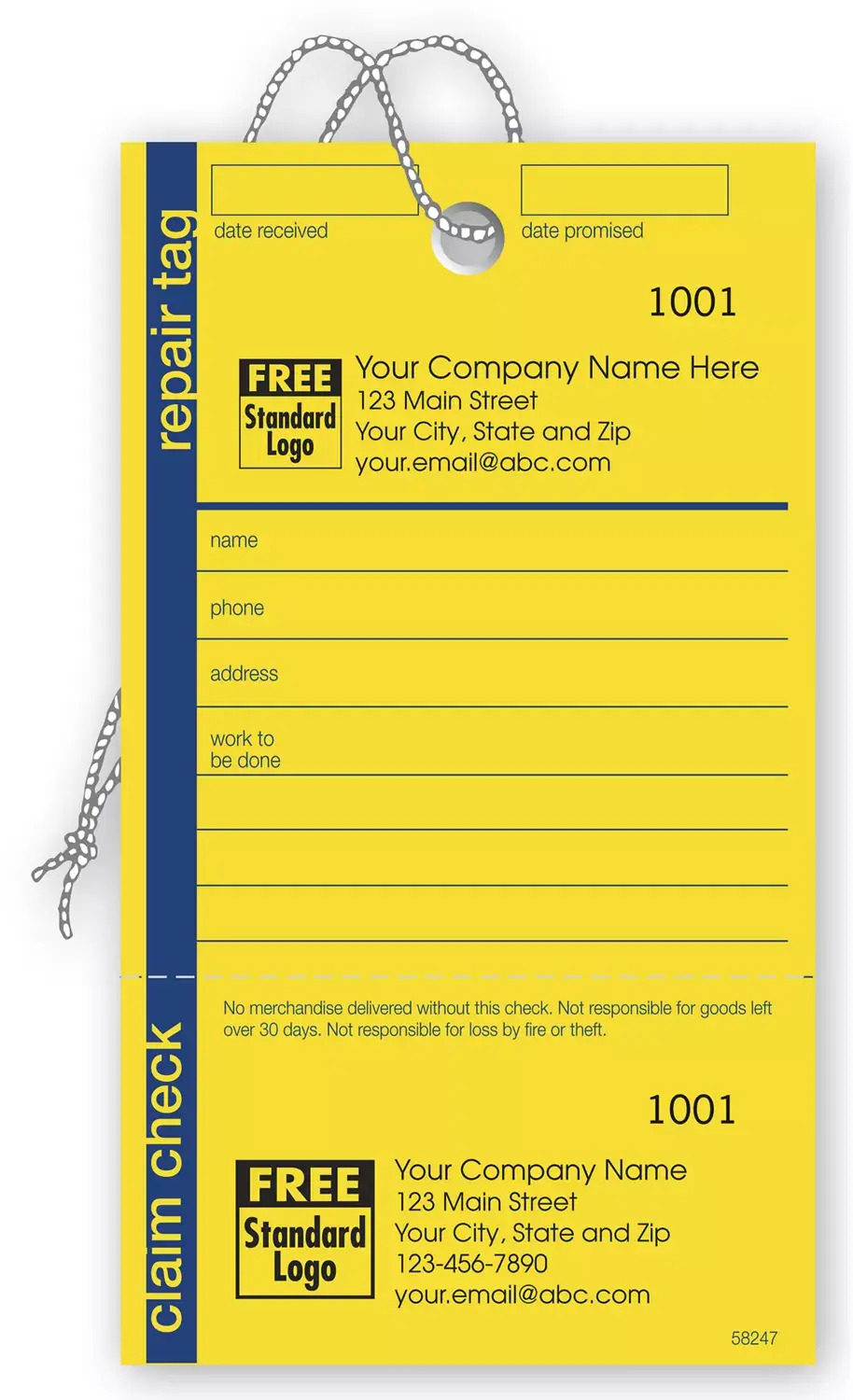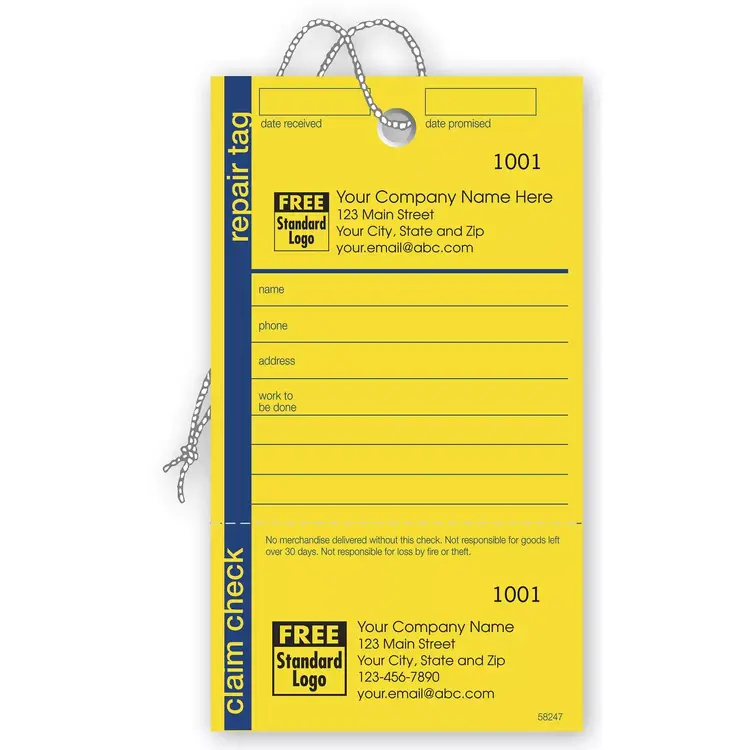 Keep track of repairs with Custom Repair Tags, designed for efficient job management and seamless tracking. Featuring your logo in black ink on a yellow and blue tag, these durable tags provide a professional and organized system for businesses handling maintenance, automotive repairs, equipment servicing, contract work and more.